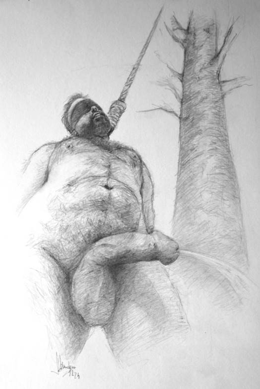 efficiency. A third rips open his shirt, strips him naked. His boots are